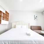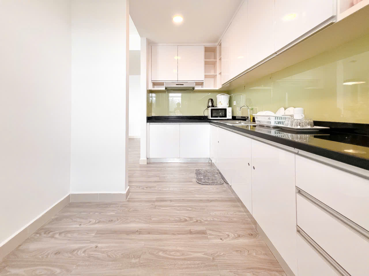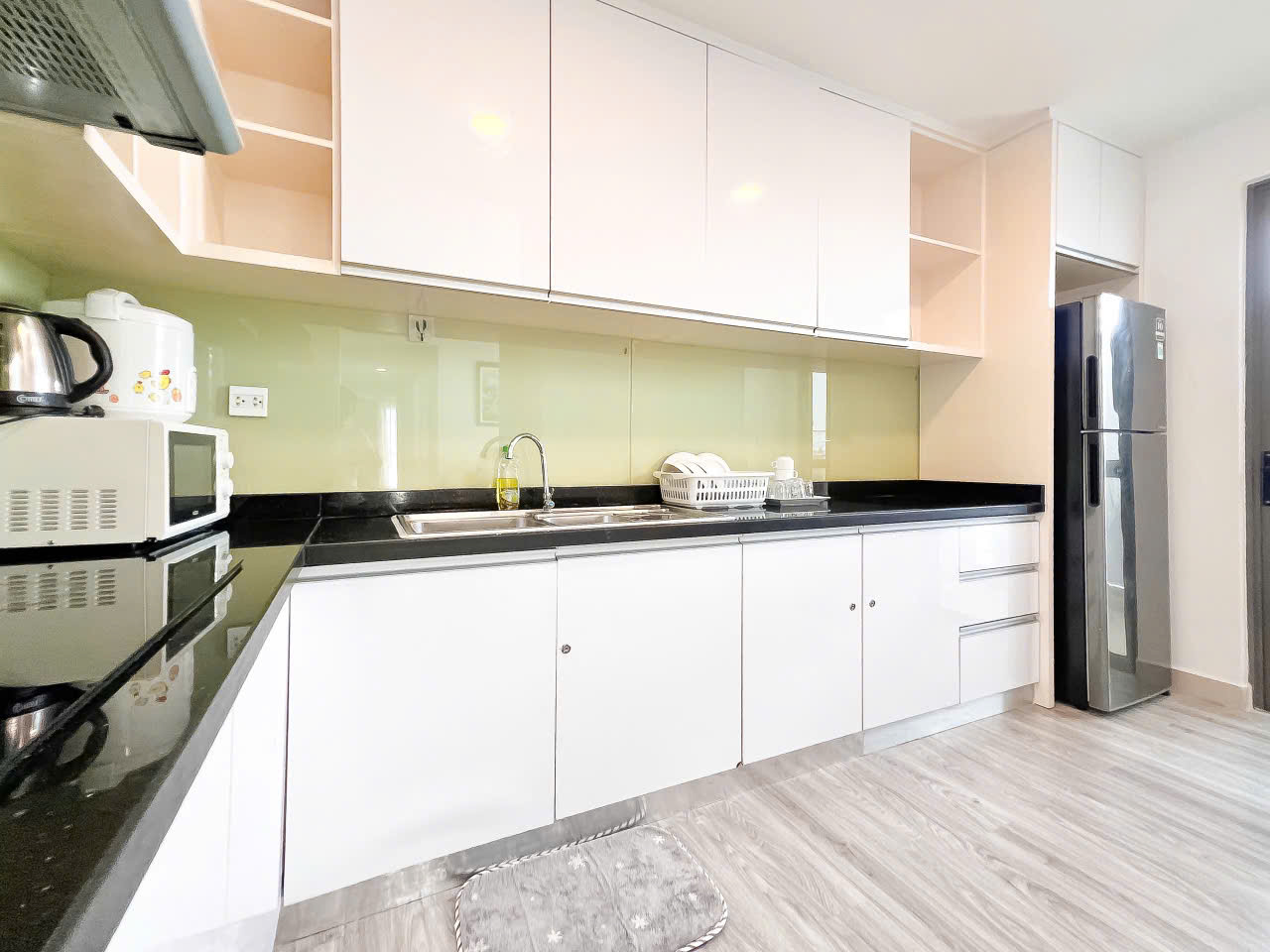 - Khu bếp đầy đủ tiện nghi: Bếp từ, tủ lạnh, lò vi sóng, máy hút mùi và các dụng cụ nấu ăn cơ bản, giúp bạn dễ dàng chuẩn bị những bữa ăn ngon tại nhà.