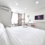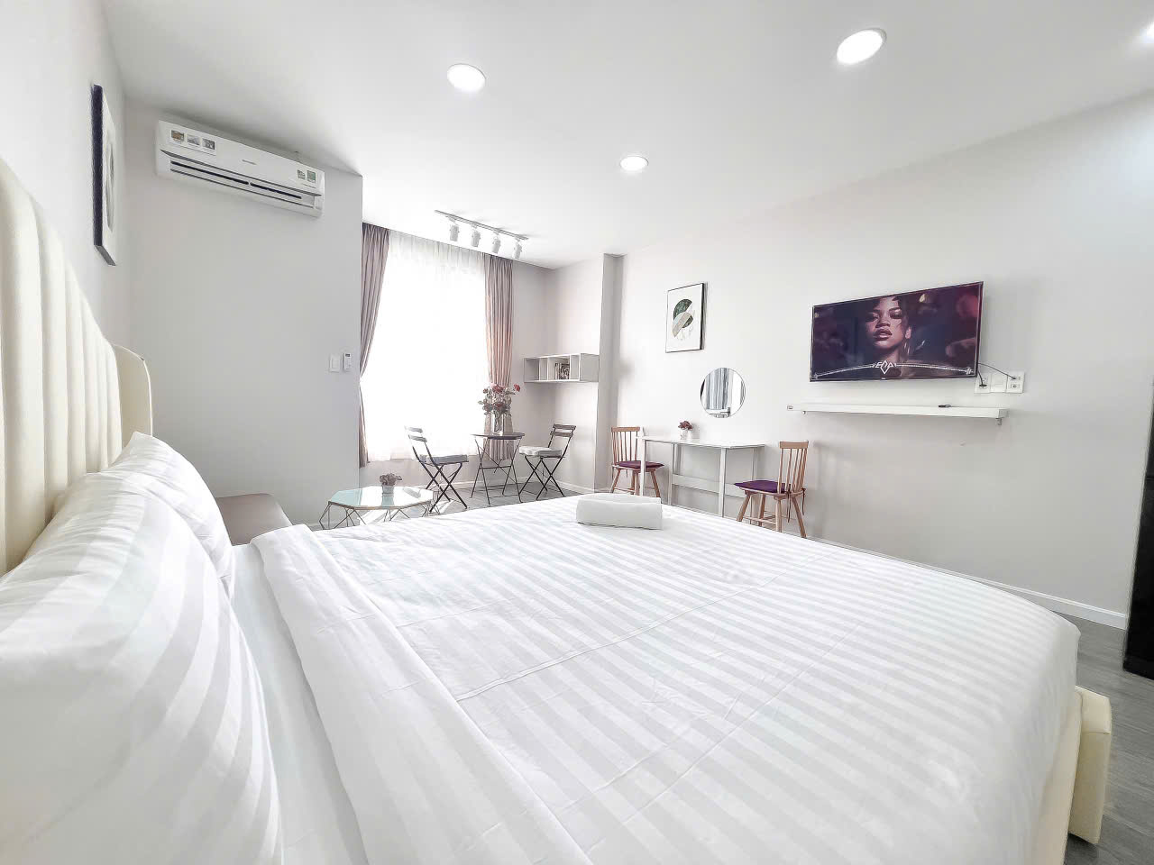 - Khu vực phòng khách và phòng ngủ kết hợp: Giường ngủ êm ái, sofa tiện nghi, TV màn hình lớn để bạn thư giãn sau một ngày dài.