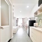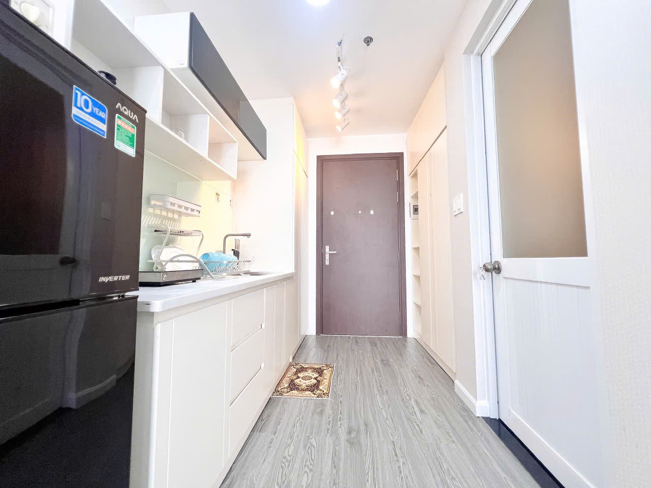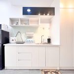 - Khu bếp nhỏ đầy đủ tiện nghi: Bếp từ, tủ lạnh, máy hút mùi, bồn rửa chén và các dụng cụ nấu ăn cơ bản, giúp bạn dễ dàng chuẩn bị những bữa ăn ngon tại nhà.