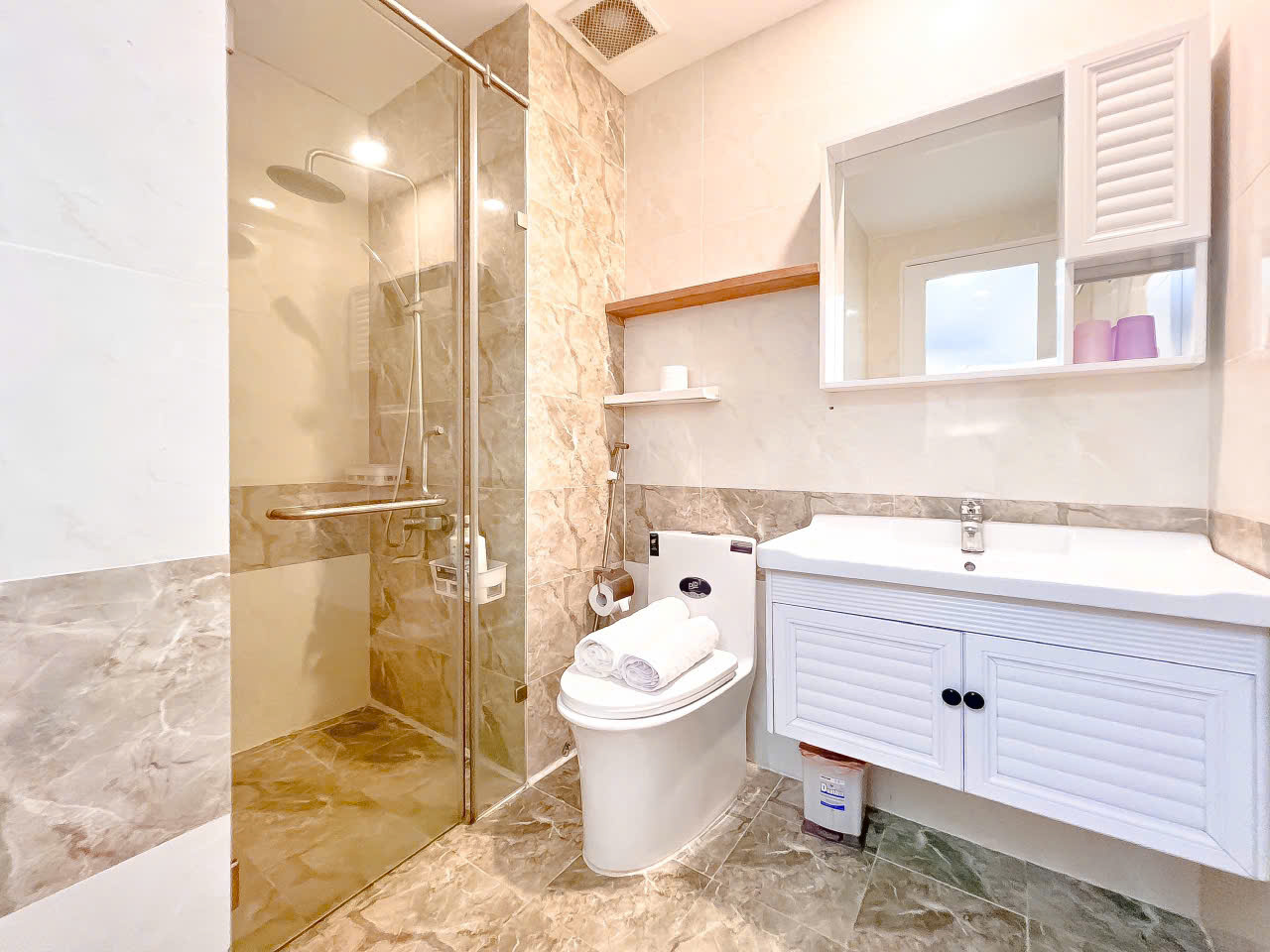 - Khu vực vệ sinh khép kín: Thiết bị vệ sinh cao cấp, máy nước nóng lạnh, đồ dùng cá nhân đầy đủ.